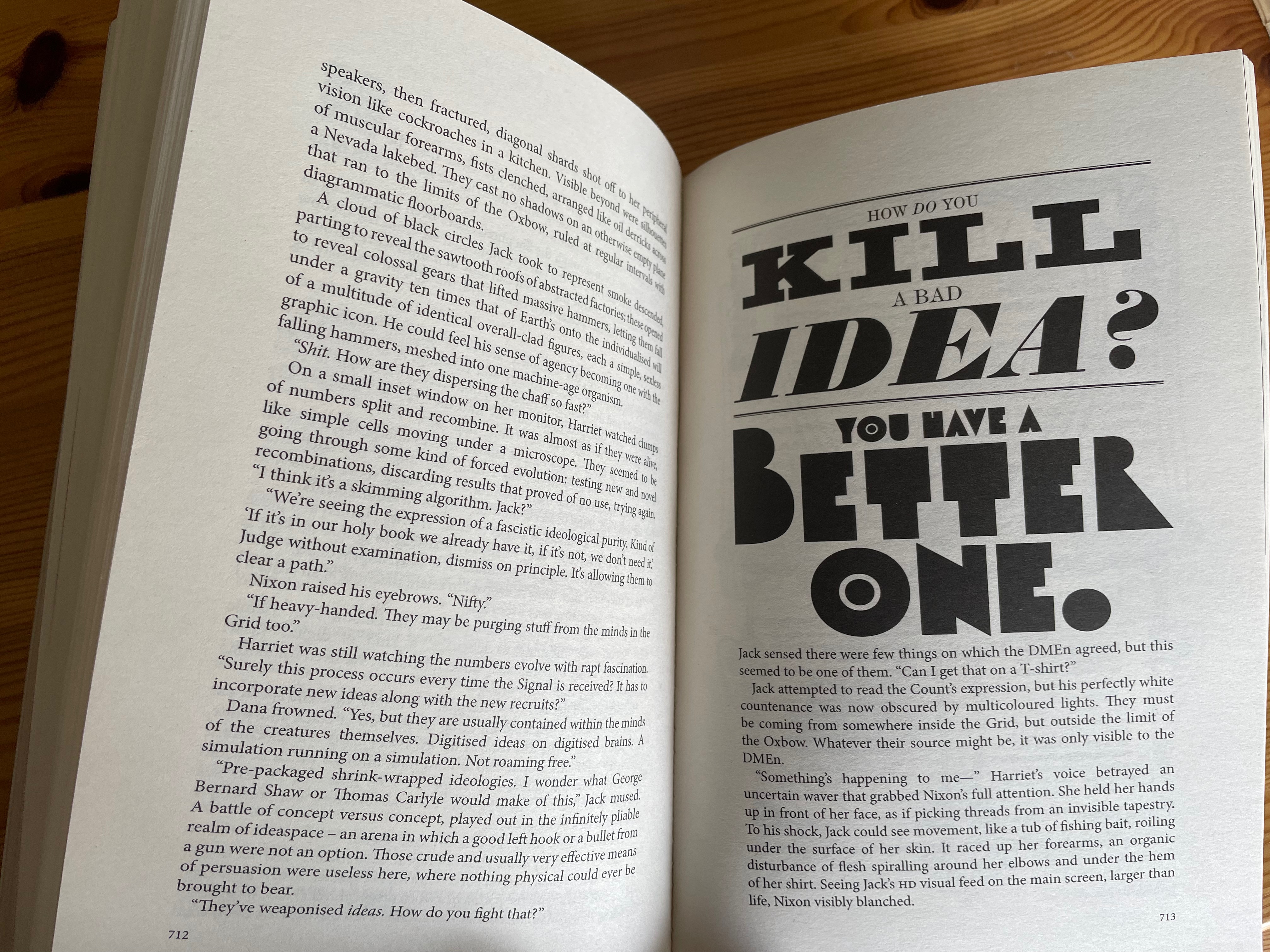 Although XX reads like science fiction, it is ultimately a novel about ideas, language and communication. Rian Hughes portrays ideas almost as independent entities that need minds in order to replicate themselves. I love the way he describes how language, when first used, changed the way humans saw the world. “After the coming of the Word, no longer would only the thing itself be the thing. The Word could bring to mind the thing just as vividly in its absence, enabling it to be spoken of, sung, shared around a fire, passed from mouth to mouth and thus travel many leagues.” And this led, eventually, to the ability to express ideas.