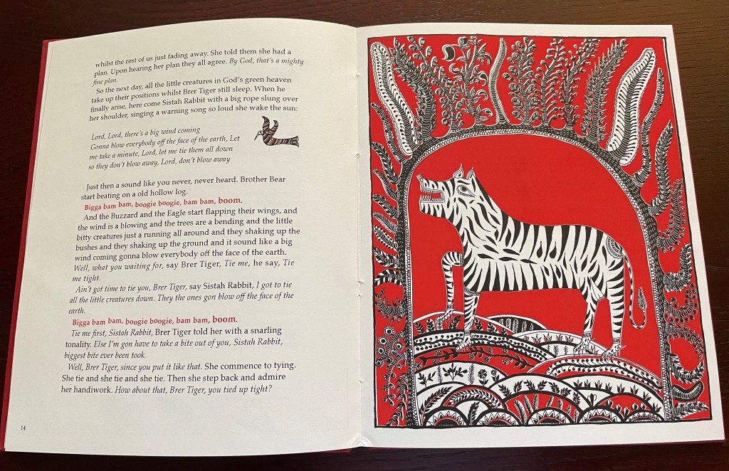 There are references to slavery in “Brer Rabbit and the People Who Could Fly”, where abused slaves float up to the sky, far out of reach of the overseer’s whip. In “Sistah Rabbit and the Big Wind”, Brer Tiger lays claim to The Clayton Field, where The Tree of Life grows, a tree “burdened with the most succulent fruit and vegetables”, a tree that the other animals are not allowed near, even when there is a long drought and they are starving. The Tiger could be a representation of the slave owners who deny their slaves the abundant food they have access to. Needless to say, in this story, Sistah Rabbit outwits Brer Tiger by using his selfishness to trap him.